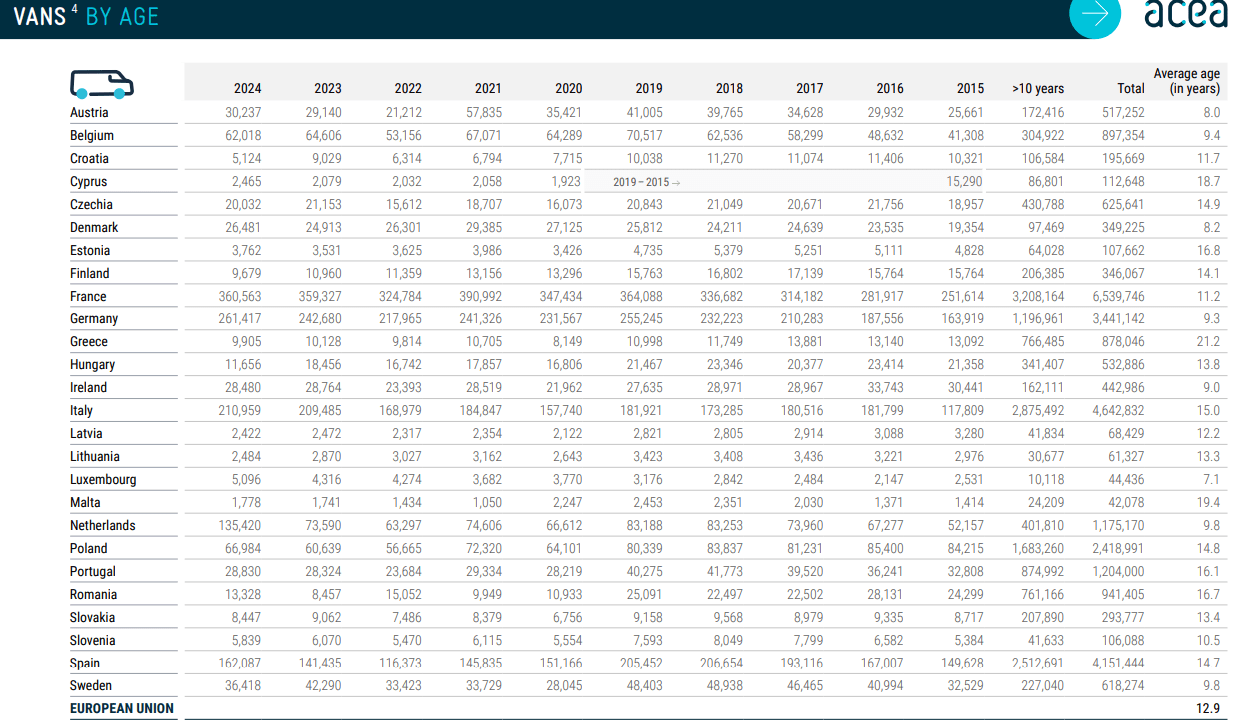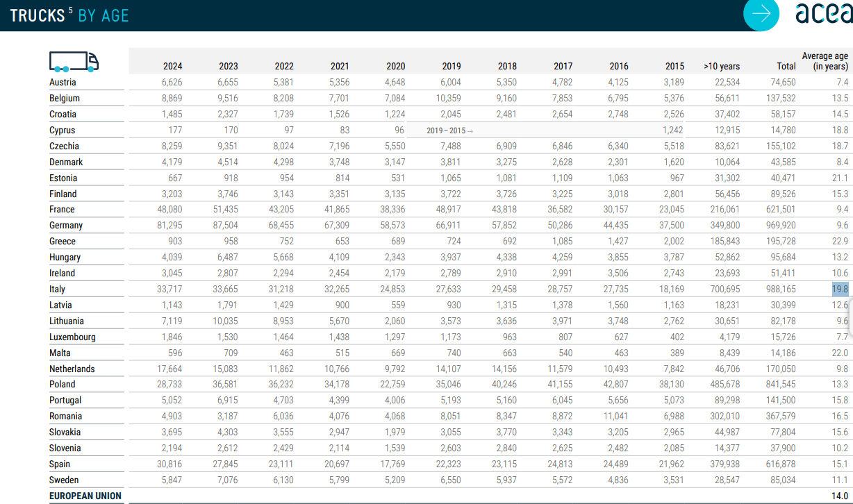 I numeri confermano: l’età media dei veicoli commerciali leggeri nell’UE è 12,9 anni. Tra i principali mercati, l’Italia risulta avere il parco furgoni più datato (15 anni), seguita da Spagna (14,7 anni) e Francia (11,2 anni). Per i camion, la media sale a 14 anni: la Grecia guida la classifica dei parchi più vecchi (22,9 anni), mentre i più recenti si registrano in Austria (7,4 anni) e Lussemburgo (7,7 anni). In Italia, la media si attesta intorno ai 20 anni (19,8).