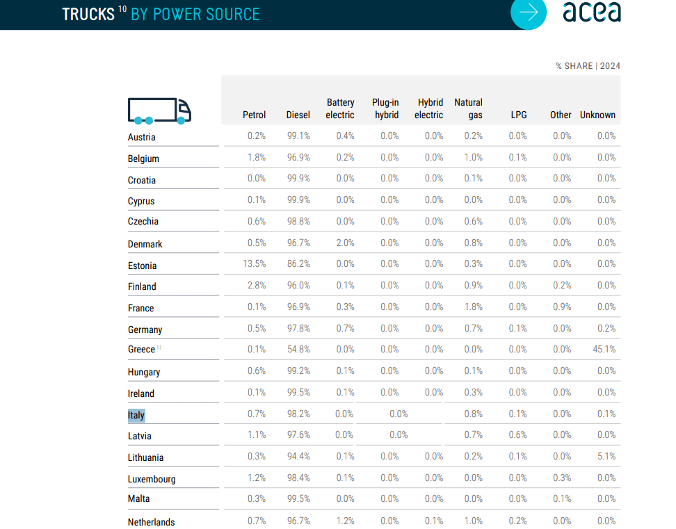 Quanto alle alimentazioni, il quadro resta dominato dal diesel. Nei furgoni, il 90,3% del parco UE è diesel, mentre solo l’1,3% è elettrico a batteria (BEV). Tra i camion, il 96,3% va a diesel; la benzina pesa 0,5% e i BEV si fermano allo 0,3%.