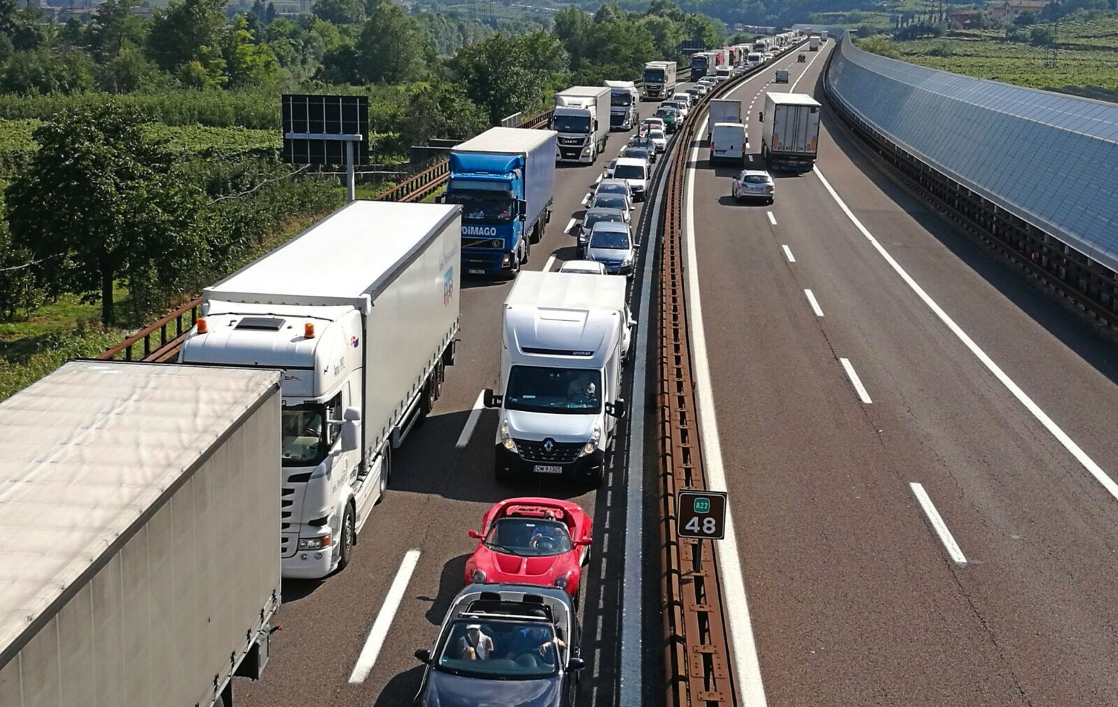 La chiusura austriaca delle frontiere con l’Italia e l’aumento dei controlli a campione su tutti gli autotrasportatori hanno creato una coda di quasi 50 km che si snoda dal Brennero quasi fino a Bressanone. L’A22 nella provincia di Bolzano è paralizzata totalmente: al traffico leggero (automobili, motocicli e truck sotto le 3,5 t) è ora vietato l’ingresso in autostrada a partire dal casello di Chiusa, poco prima di Bressanone. Chiusi tutti i caselli in entrata a partire da Bolzano nord. I controlli sul traffico verso il Land del Tirolo non avvengono solo presso il passo del Brennero, ma anche negli altri valichi di competenza austriaca confinanti con l’Alto Adige, ovvero passo Resia e Sillian/Prato Drava. Sono iniziati i controlli anche in Carinzia, al confine con il Friuli Venezia-Giulia, seppur con qualche ritardo.