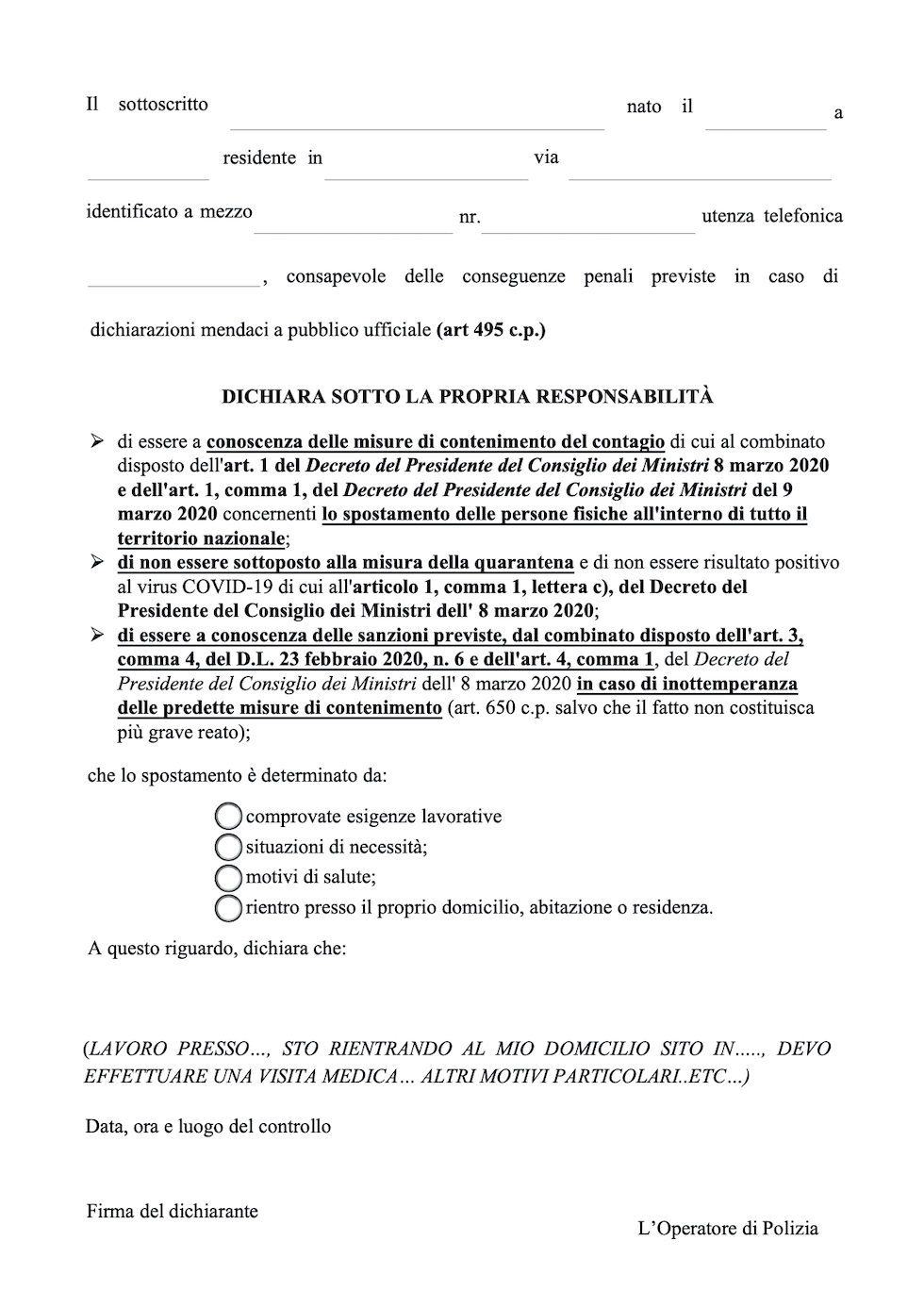 Per far fronte all’emergenza coronavirus e disincentivare chiunque ad uscire di casa affinché i contagi diminuiscano, con una nota pubblicata sul sito ufficiale del Ministero dell’Interno, è stata rilasciata la nuova autodichiarazione da compilare e stampare (disponibile in jpg in fondo all’articolo) in caso di spostamenti dalla propria abitazione. La nuova misura per l’autocertificazione è stata resa necessaria dai numerosi comportamenti sbagliati che ancora, purtroppo, continuano a vedersi in Italia in questi giorni così difficili: nei primi giorni dall’entrata in vigore del Dpcm, su un totale di 665.000 persone fermate, quelle denunciate sono state 27.500.