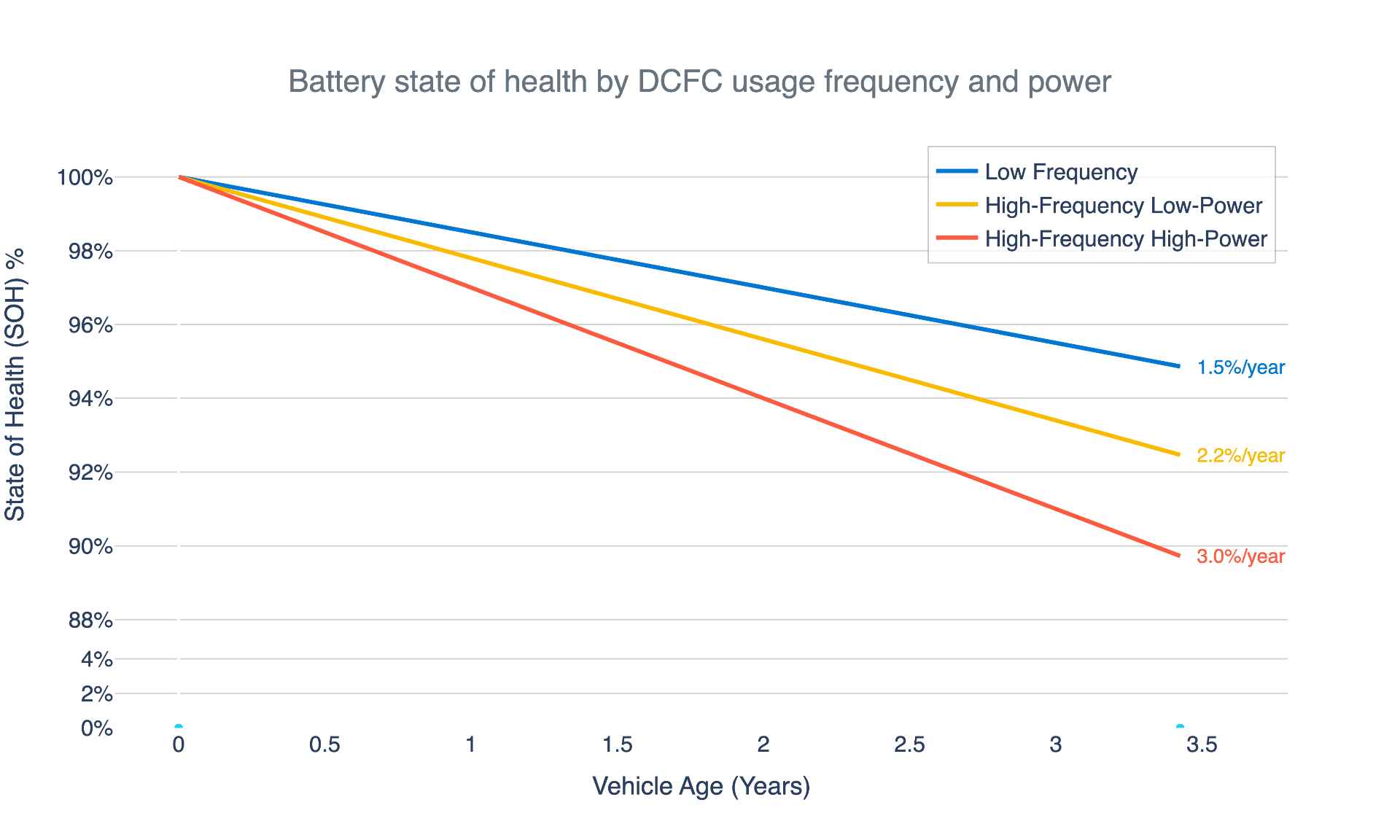 Geotab ha provato a dare una risposta a queste e altre domande promuovendo uno studio che ha fornito un dato sostanziale: anche quando sottoposte a cicli di ricarica ‘misti’ (bassa e alta potenza), le batterie si degradano in media del 2,3% ogni anno. In soldoni, circa il 25% di rendimento in meno dopo 10 anni. La percentuale sale al 3%, invece, con cicli di ricarica esclusivamente ad alta potenza (DC), quindi oltre i 100 kW.