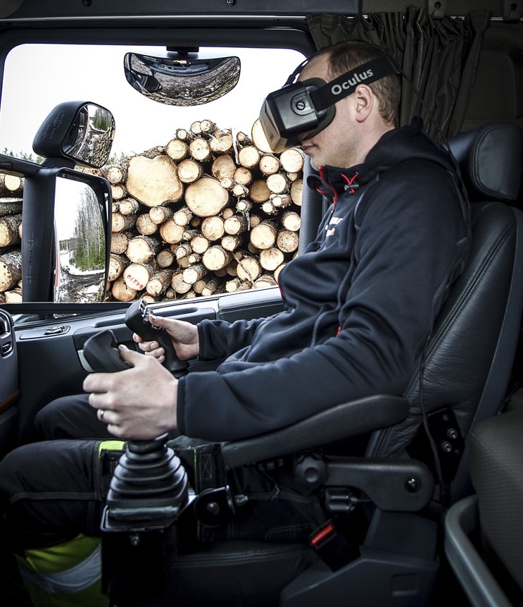 HiVision di Hiab per attrezzature Loglift e Jonsered dispone di 4 telecamere Hd su tetto cabina e braccio gru più un software di realtà virtuale che propone sul visore (una maschera da indossare) l’immagine tridimensionale degli spazi circostanti al camion, con angolo visivo di 270 gradi.