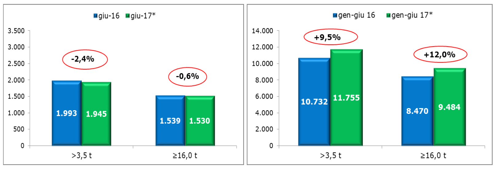 Per il mese di giugno, il Centro Studi e Statistiche dell’UNRAE ha elaborato, sulla base dei dati forniti dal Ministero delle Infrastrutture e dei Trasporti, una stima delle immatricolazioni di veicoli industriali con massa totale a terra superiore alle 3,5 tonnellate di 1.945 unità, in diminuzione del 2,4 per cento rispetto alle 1.993 dello stesso mese del 2016. Nel primo semestre del 2017 l’incremento stimato del mercato, rispetto allo stesso periodo del 2016, si attesta a più 9,5 per cento, con 11.755 unità immatricolate contro 10.732.