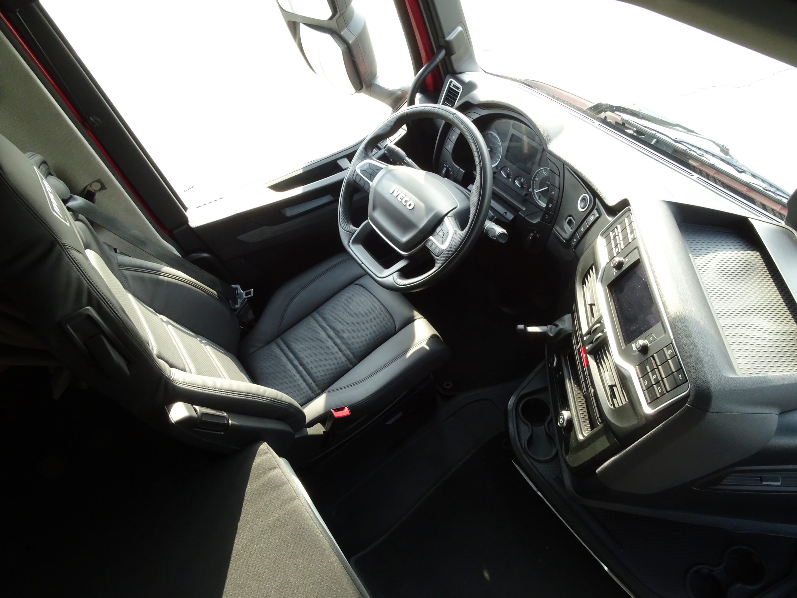 Esternamente, ad esempio, motivo a ‘V’ della calandra a parte, spiccano il tetto più sporgente, i cantonali irrobustiti (in ottemperanza alla direttiva Ece 29.03) che si raccordano in modo più armonico con le linee laterali convogliando al meglio il flusso dell’aria. E poi gli spoiler laterali più profondi, l’assenza dei deflettori, il parabrezza non più applicato con guarnizione bensì incollato, il tettuccio vetrato che funge adesso anche da uscita di emergenza, la presenza di bandelle gommate a sigillare la combinazione trattore-semirimorchio a beneficio di una migliore resa aerodinamica. Non per niente, infatti, il Cx è più favorevole del 12 per cento rispetto allo Stralis, contribuendo in tal modo a un risparmio dei consumi del 4 per cento. Non poca cosa.