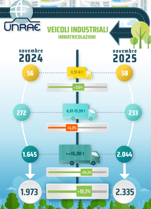 Nel mese di novembre 2025, il mercato italiano dei camion oltre le 3,5 tonnellate ha registrato una crescita significativa. Secondo le elaborazioni del Centro Studi e Statistiche UNRAE, basate su dati del Ministero delle Infrastrutture e dei Trasporti, le nuove immatricolazioni sono salite del 18,3% rispetto allo stesso mese del 2024: 2.335 unità contro 1.973.