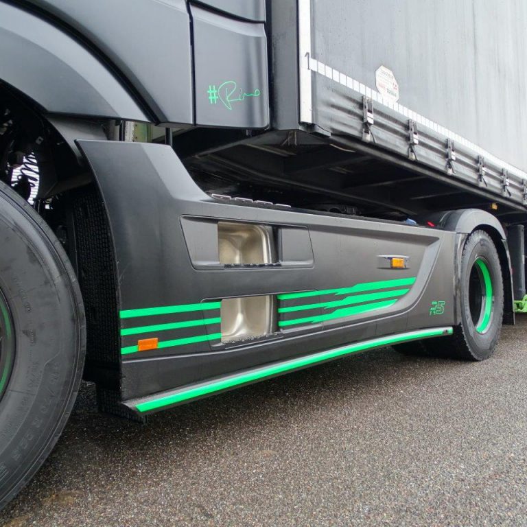Partendo dalla base di un Actros total black nella versione con mirror cam in luogo degli specchi convenzionali, motori Euro 6d performanti e parsimoniosi, combinati con una sventagliata di sistemi di assistenza alla guida capaci di assicurare efficienza e sicurezza (dall’Active brake assist 5 di serie all’Active drive assist, dal Sideguard assist al Predictive powertrain control), per l’Actros R5 ecco allora gli eleganti inserti in verde fluo (colore «moderno e ipnotico» dice Rino Acito) per frontale, visiera parasole inclusa, tetto, laterali, portiere e minigonne, a esaltare lo spirito competitivo dell’ammiraglia di Stoccarda, e al tempo stesso anche personalità e carattere.