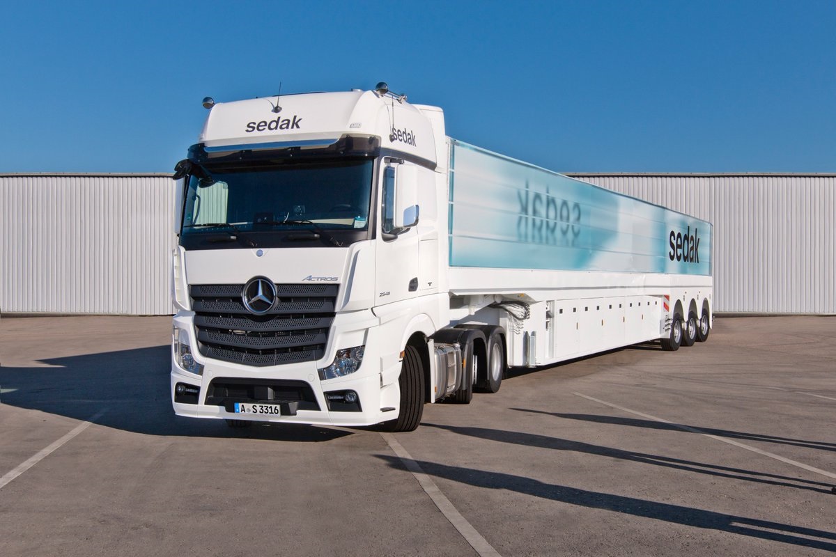 Inciampo numero due, il rispetto degli ingombri in curva, soprattutto per evitare che su rotatorie e svolte il trailer finisse per urtare (o scavalcare) cordoli e gradini, imprimendo sobbalzi dannosi al carico. E la soluzione è stata trovata con l’utilizzo di un terzo asse sterzante a controllo elettronico che pilota in modo intelligente i due supersingle di coda e favorisce l’inserimento in curva del bilico evitando traiettorie che ‘taglino’ le rotatorie più anguste.