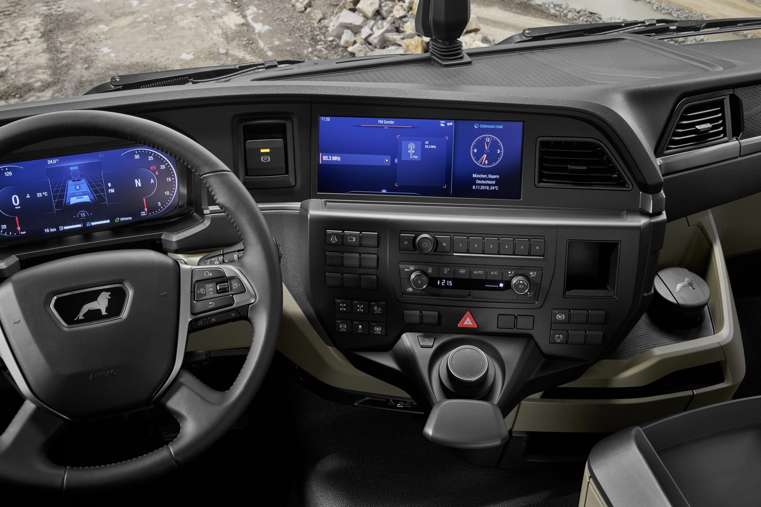 Nel nuovo MAN TG, l’azienda ha riprogettato e riposizionato il comando del cambio MAN TipMatic con un commutatore a leva sulla colonna dello sterzo a destra del volante. Sia il campo di guida che il programma di marcia del cambio possono essere selezionati con una presa migliore e con un controllo più sicuro direttamente dietro la corona del volante. Il nuovo commutatore a leva sulla colonna dello sterzo comprende anche il comando del freno continuo. Nelle immediate vicinanze, a destra accanto al display principale del cruscotto, si trova anche l’interruttore per l’attivazione del nuovo freno di stazionamento elettrico.