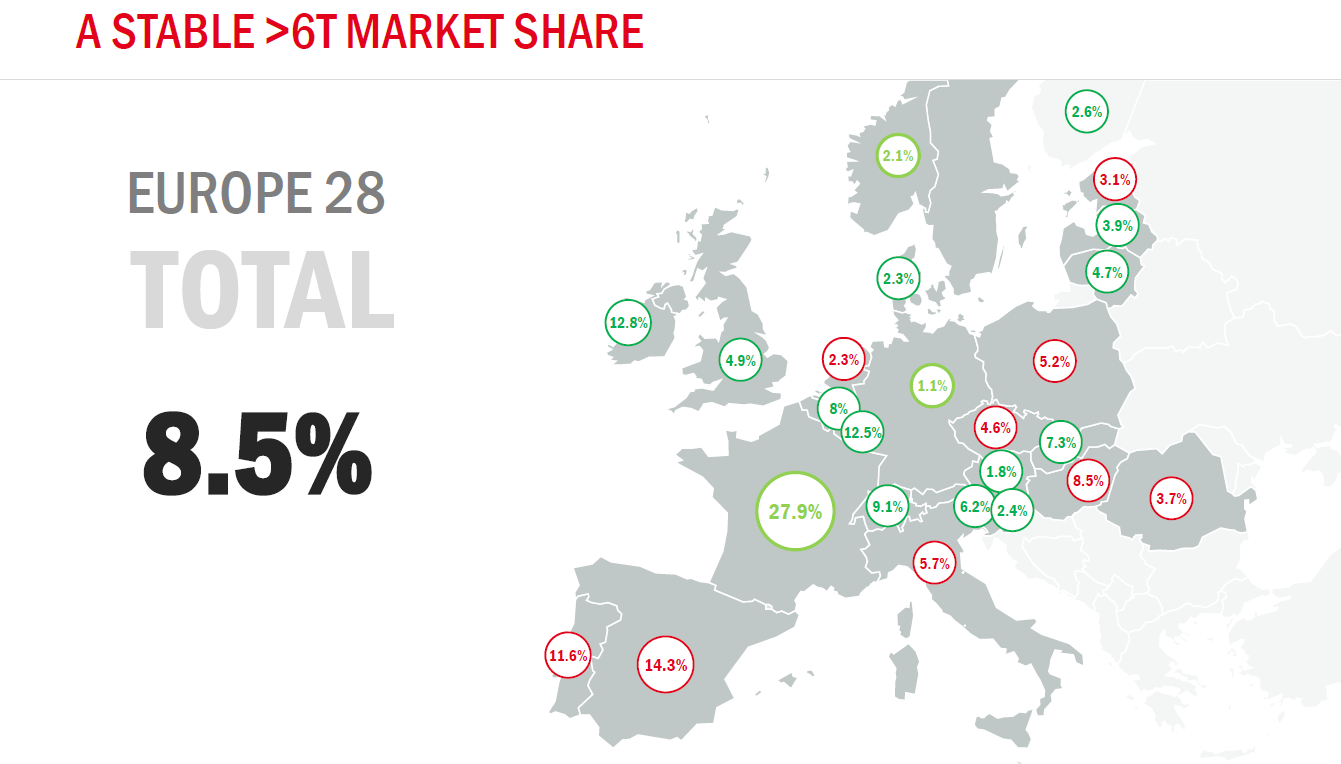 Renault Trucks ha mantenuto i volumi in un mercato europeo contrastato, con un primo semestre molto dinamico, in crescita del 15%, e un secondo semestre in contrazione del 18%. Sul mercato europeo dei veicoli superiori a 6 tonnellate, Renault Trucks ha registrato una quota di mercato dell’8,5%, del tutto stabile rispetto al 2018, con un leggero calo di 0,1 punti percentuali, mentre la quota di mercato è cresciuta di 0,3 punti percentuali sulle gamme intermedie da 6 a 16 tonnellate.