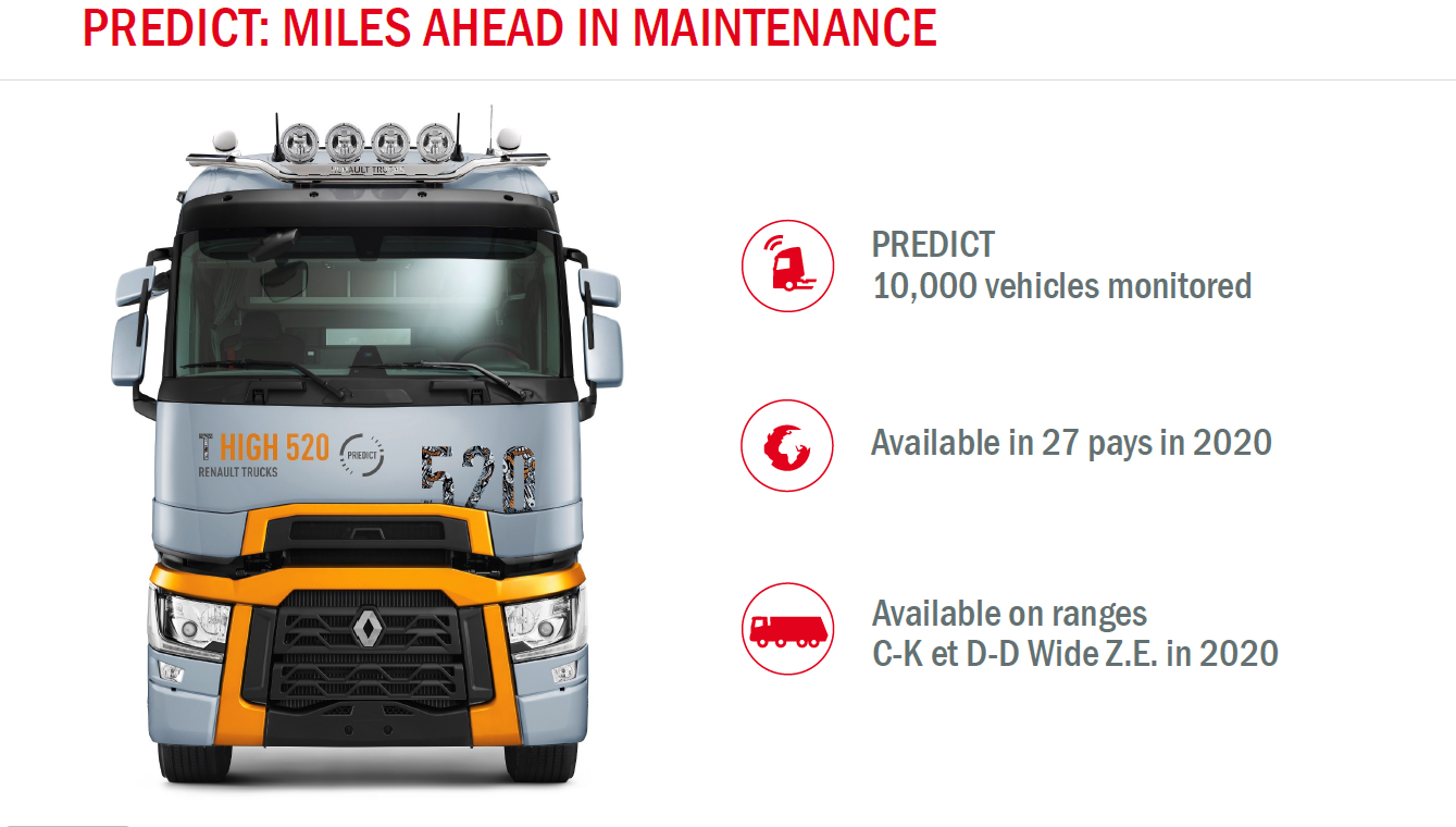 Si registra un solido aumento del 3% del giro d’affari dei ricambi nel 2019, nonostante il calo dell’attività di trasporto. Anche il portafoglio di veicoli con contratto di manutenzione superiore a 36 mesi è cresciuto del 13%, con oltre 35.000 veicoli contrattualizzati. Il 2019 è stato segnato anche dal lancio dell’offerta di manutenzione predittiva, Start & Drive Excellence Predict, in quindici paesi europei per i veicoli delle gamme T e T High. Nel 2020 Renault Trucks estenderà questa offerta ad altri dodici paesi e alle gamme C, K e D e D Wide Z.E.
