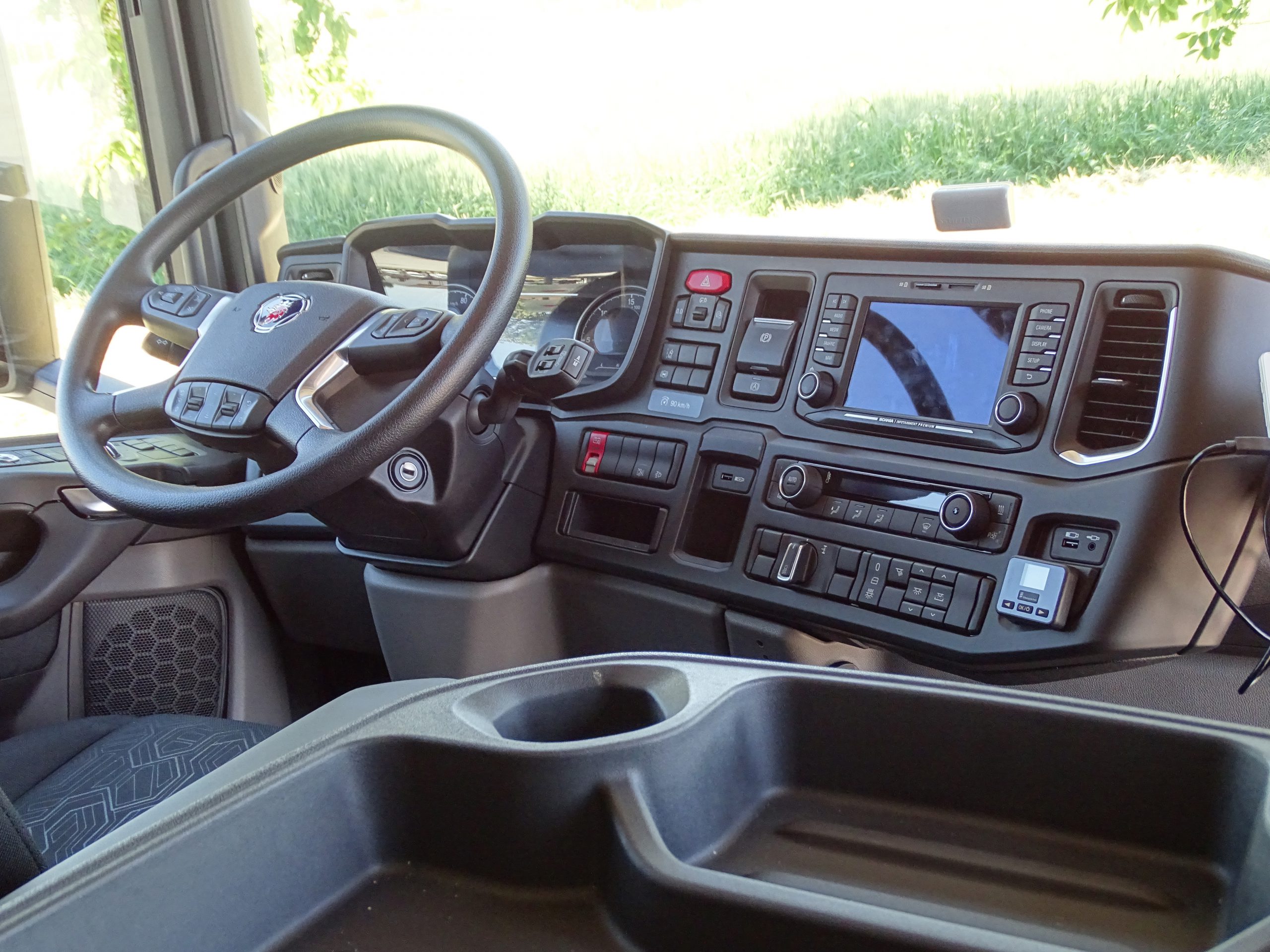 Il conseguente beneficio in termini di minore stress al termine di una giornata di lavoro è del tutto evidente. Peraltro, ben si combina con un livello di comfort a bordo in linea con la tradizione dei modelli Scania, quindi eccellente, nel caso specifico certamente favorito dall’adozione (peraltro inderogabile) delle sospensioni pneumatiche integrali (a due soffietti sull’asse di trazione), la cui azione riduce ai minimi termini l’inevitabile beccheggio indotto dai 2.030 millimetri dello sbalzo anteriore, più che dagli oltre due metri abbondanti di profondità dell’unica taglia (con tre altezze di tetto disponibili) prevista per questa cabina. E se certamente inusuale per un veicolo da distribuzione è la posizione di guida più bassa (che peraltro non limita l’orizzonte), vero è che un utile aiuto per una migliore visibilità arriva dalla vetratura nella porta lato passeggero. Anche sulla sicurezza, insomma, niente sconti.