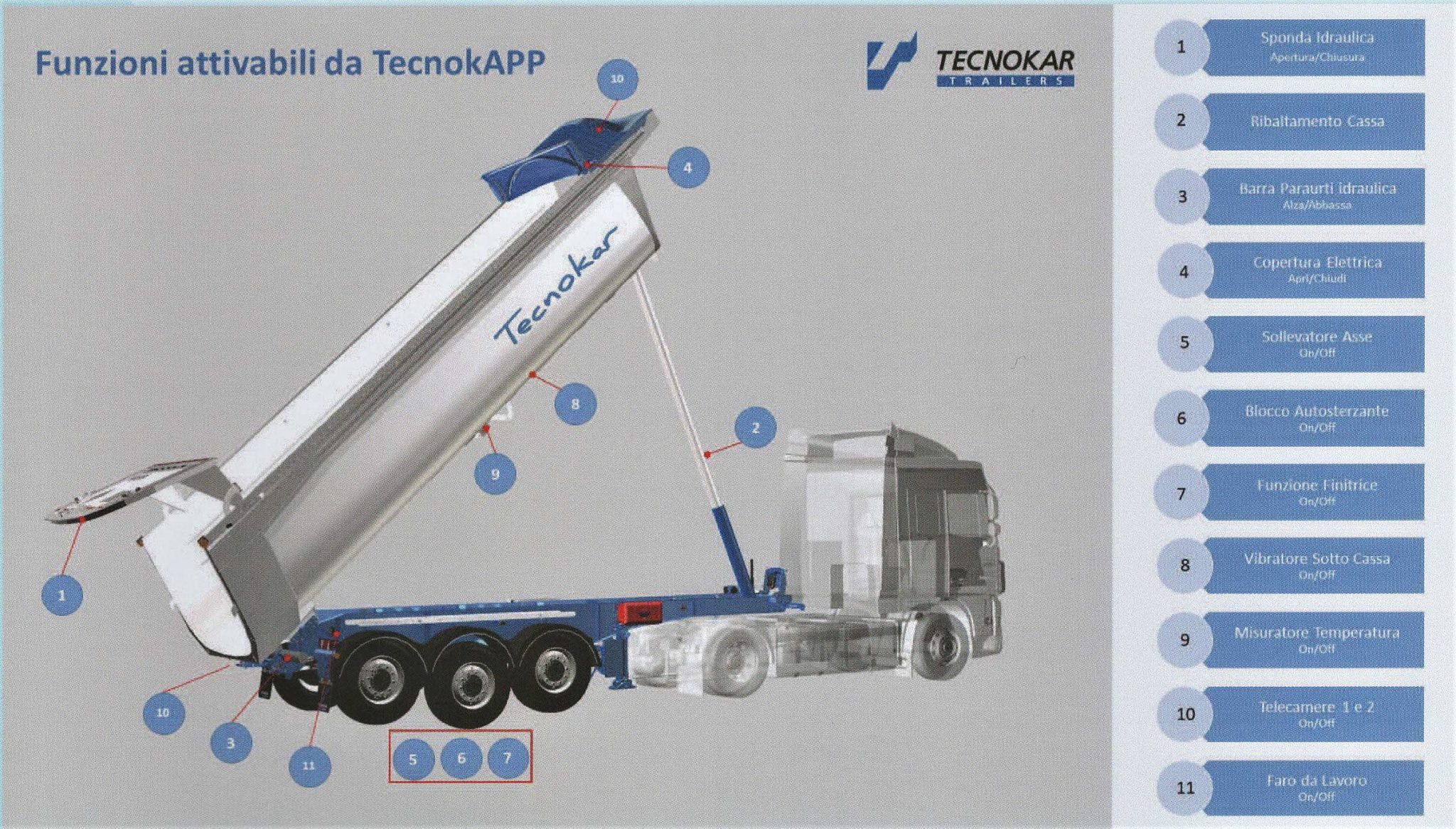 Le funzioni attivabili da TecnokAPP sono undici e spaziano dal semplice comando idraulico del paraurti posteriore, fino al monitoraggio della temperatura nel trasporto di conglomerati bituminosi.