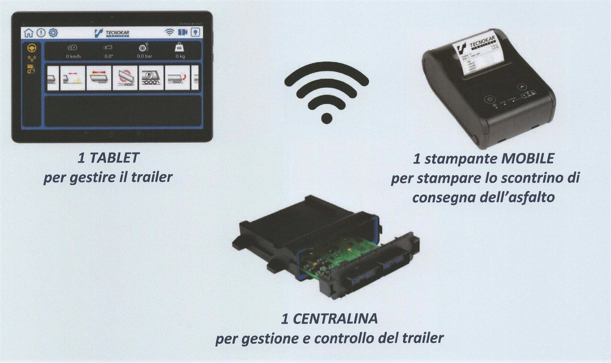 Un qualsiasi tablet dedicato permette l’interfaccia con l’operatore. E infine si ha una stampante mobile per stampare gli scontrini di consegna dei conglomerati bituminosi.