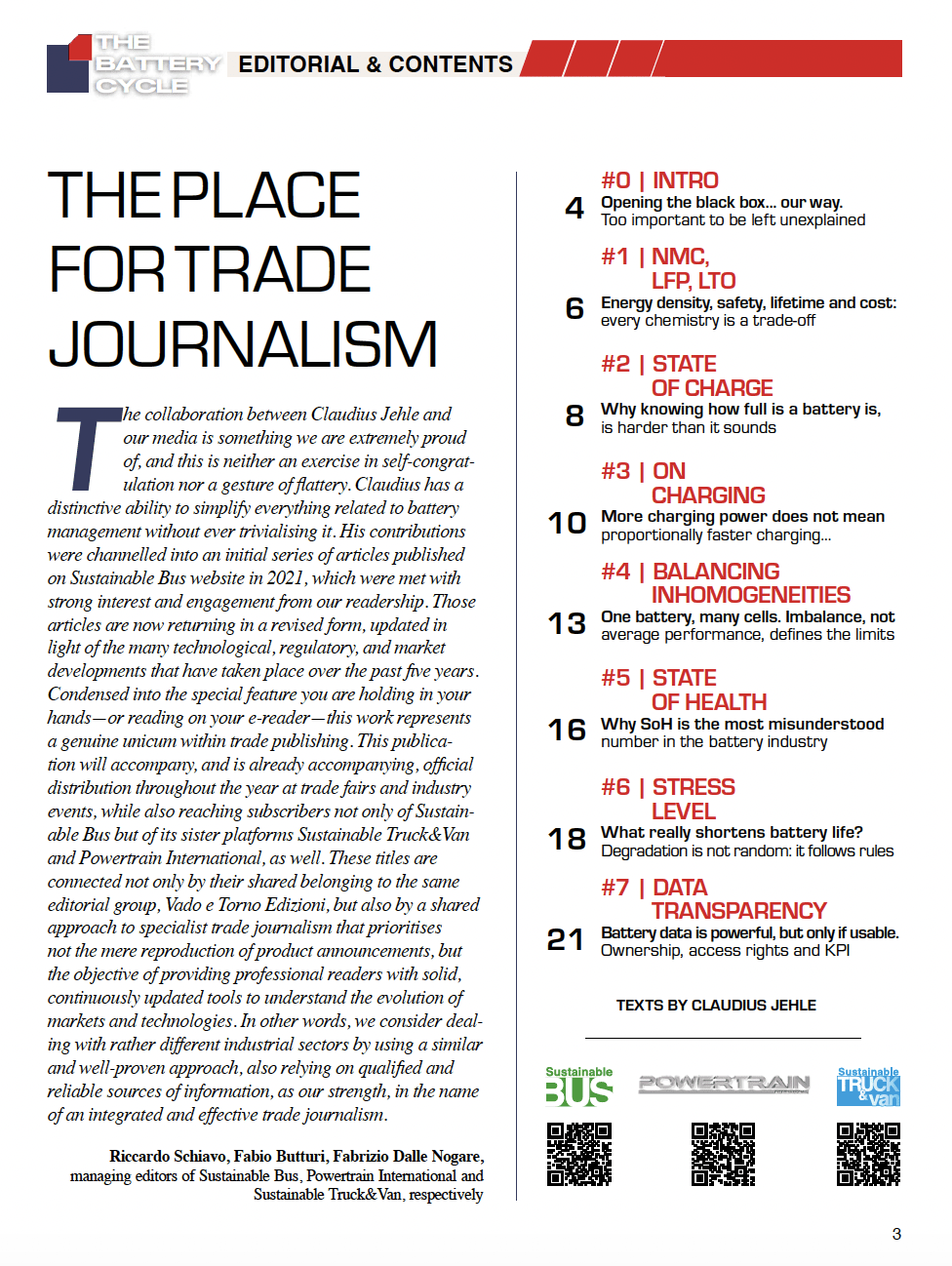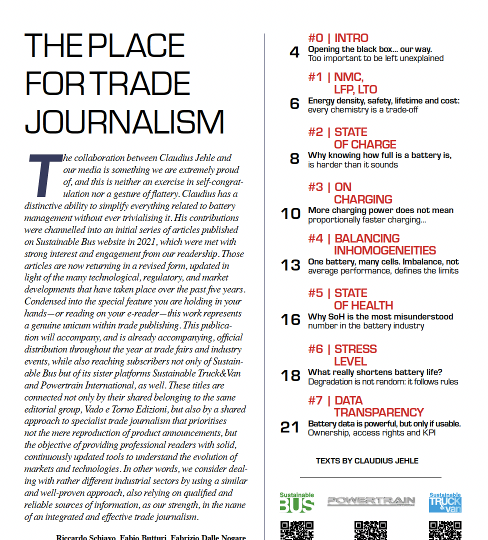 Si tratta di uno speciale monografico che accompagnerà i quattro numeri 2026 di Sustainable Bus, rivista facente parte dell'ecosistema editoriale della casa editrice Vado e Torno, e si baserà sui testi di Claudius Jehle, CEO dell’azienda tedesca di analisi delle batterie volytica diagnostics. La monografia circolerà anche tra i lettori di Sustainable Truck&Van e Powertrain International, rafforzando così il dialogo tecnico intersettoriale tra i mondi bus, truck e powertrain.