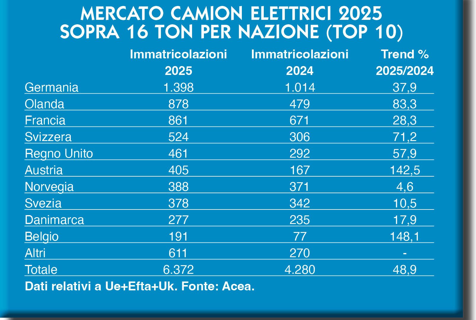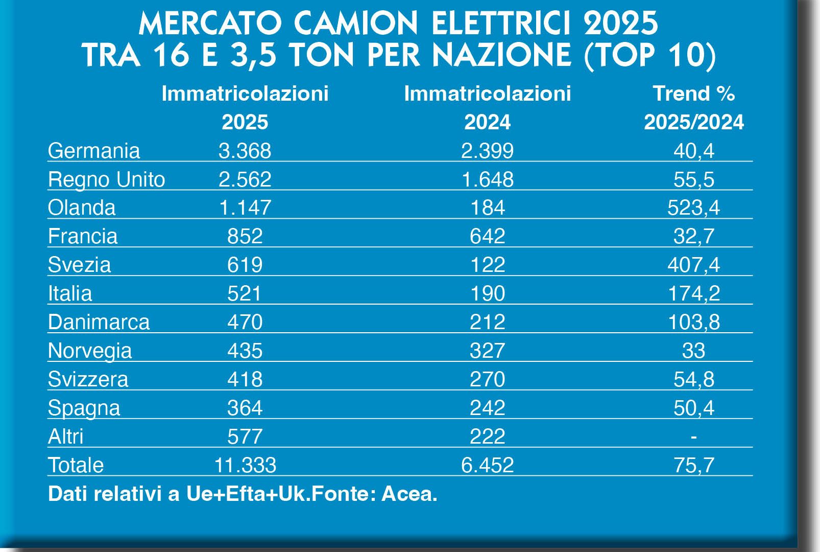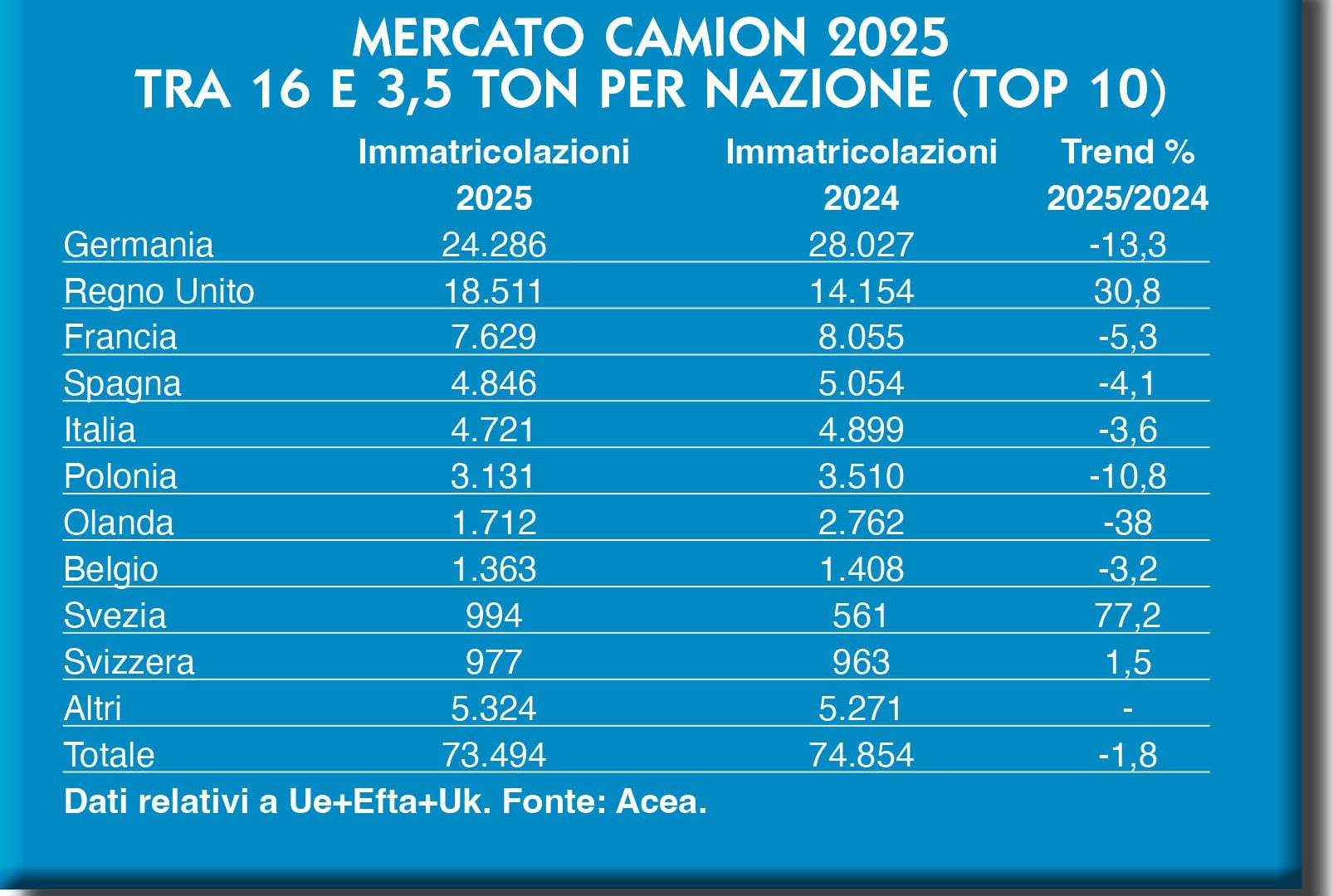 Salendo di stazza, Acea isola il segmento dei medi, che va convenzionalmente da 3.501 a 16 mila chili di massa totale a terra. Un segmento che chiude il 2025 sostanzialmente in linea, in valori assoluti, con il 2024 (-1,8 per cento) e dominato ancora una volta dalla Germania, sebbene la distanza con i volumi di mercato del Regno Unito si sia notevolmente assottigliata quest’anno. Le nazioni presenti in top-ten sono praticamente le stesse del 2024, con la sola eccezione della Svezia che prende il posto dei vicini norvegesi. In generale, Svezia e Uk a parte, il segno meno impera.
