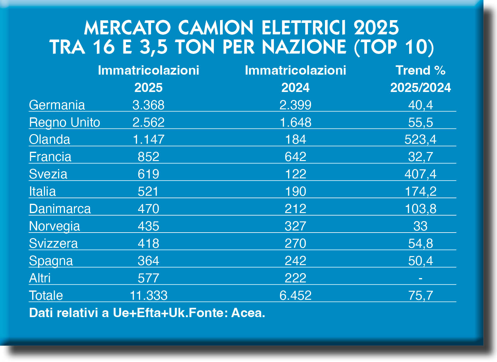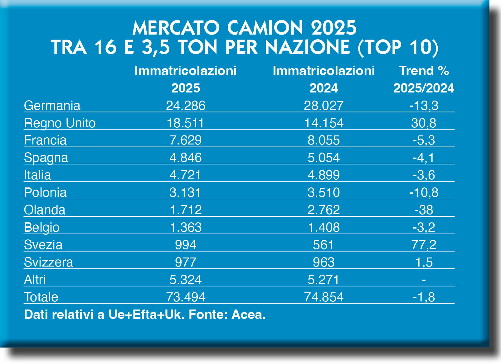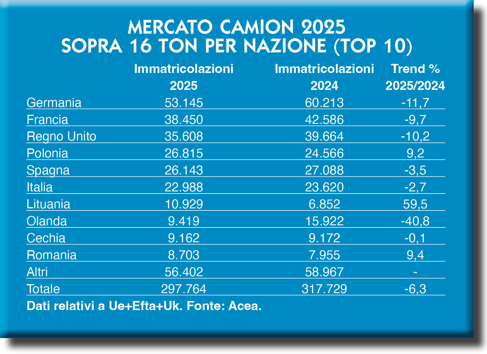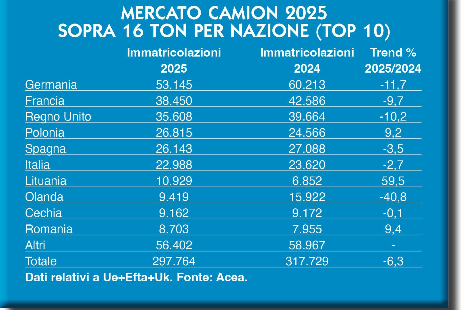 Il settore che più ci riguarda, quello del trasporto commerciale leggero e pesante, chiude il 2025 con il segno meno nell’area geografica che dallo scorso anno consideriamo nelle nostre analisi. Vale a dire le nazioni che aderiscono all’Unione Europea, ma anche la cosiddetta area Efta che comprende Svizzera, Norvegia e Finlandia, oltre al Regno Unito, non più parte dell’Unione già da qualche anno ma senza dubbio uno dei mercati principali in ambito continentale. Ancora una volta, i dati sono forniti da Acea, l’associazione che riunisce i costruttori automotive e che al suo interno ha una sezione dedicata al trasporto pesante.