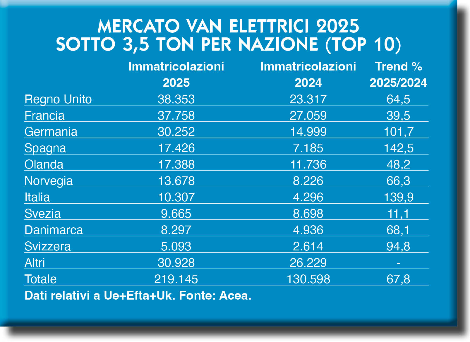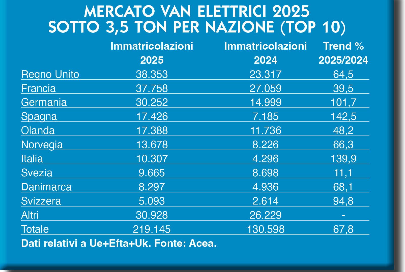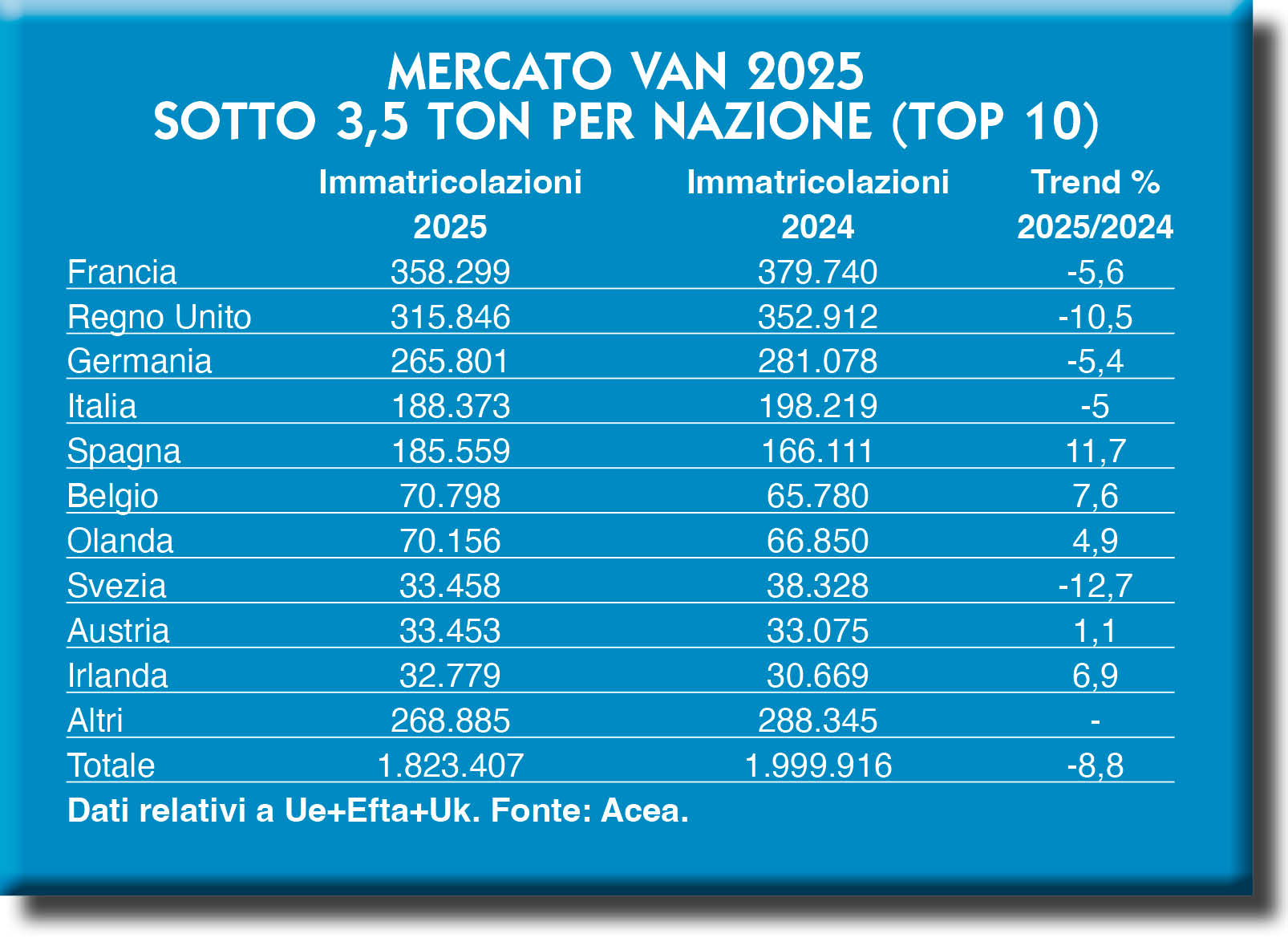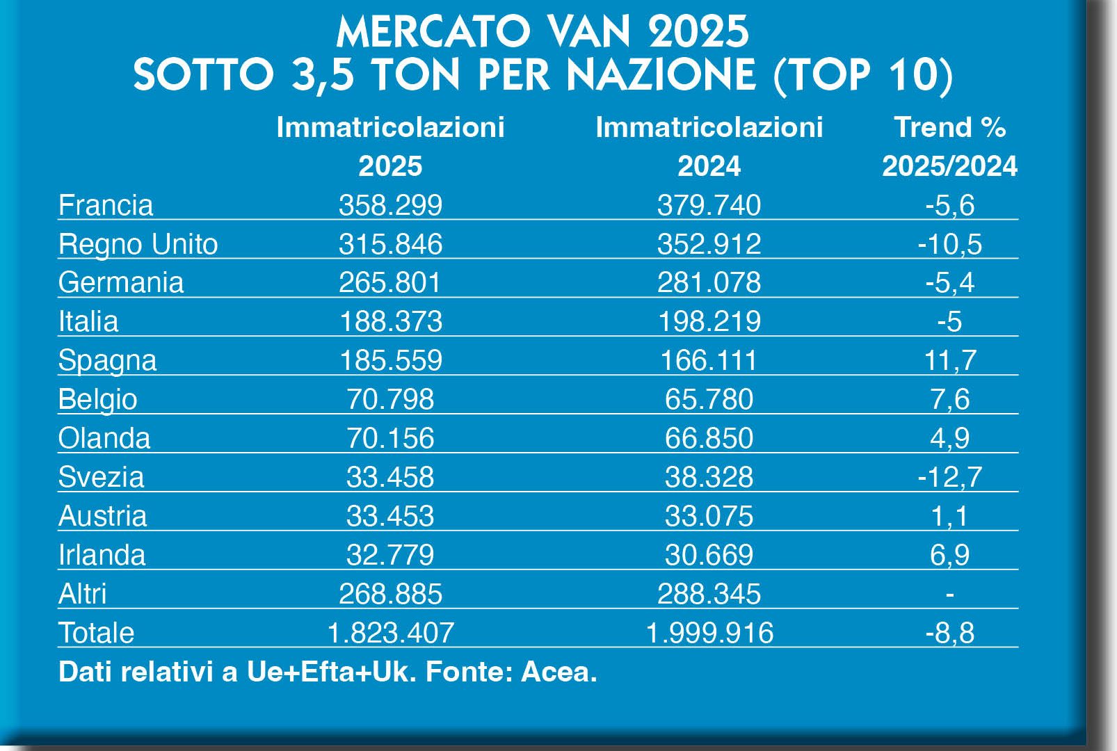 Tra i van, Acea aveva comunicato una quota di immatricolazioni complessive di poco superiore ai due milioni di veicoli (per la precisione, 2.002.023) nell’area Eu27+Efta+Uk. Gli aggiustamenti fatti nel corso dell’anno hanno riportato la rilevazione di pochissimo sotto la soglia dei due milioni di veicoli per quanto riguarda il 2024 (1.999.916). Poco cambia, al di là della soglia psicologica, per così dire, perché nel 2025 ci si è fermati un po’ più in basso, a poco più di 1.823.000 immatricolazioni di veicoli commerciali leggeri, in calo anno su anno dell’8,8 per cento.